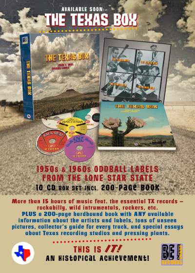 THE TEXAS BOX - 1950S & 1960S ODDBALL LABELS (10 CD box incl 200 page book. Stunning selection or rare Texas Rockabilly, Hillbilly & Country. ![]() Texas boxset promo video Track listing: CD 1: 1 Orville Couch: Wild Girl 1964, 2 Link Davis: Rice & Gravy 1961, 3 Link Davis: Johnny Be Good 1961, 4 Bill Boyd The Cowboy Rambler: Rockin' And Rollin' My Country Songs Away 1959, 5 Jackie Dallas & The Tiaras: Bull Moose 1965, 6 Daniel James: Rock Moon Rock 1957, 7 Johnny Watson: Come To The Party 1958, 8 Red Mansel: My Only One 1958, 9 Rocky Williams: Rock Cinderella 1959, 10 Tommy Trent: Just For Tonight 1959, 11 Tommy Trent: A Mile To The Mailbox 1959, 12 Hank Walker: Reckless Romance 1962, 13 Mike Pettit & The Stags: It's AReamer 1960, 14 Dick Barton's Rebels: Take This Message, Darling 1960, 15 Dick Barton's Rebels: Yes Baby, I'm Scared 1960, 16 Dick Barton & The Rebels: I Get The Blues 1961, 17 The Tune Masters: Down The Line 1963, 18 Coye Wilcox: You Gotta Quit Cheatin' 1959, 19 The Country Dudes: Have ABall 1959, 20 Dave Atkins & His Offbeats: Shake-Kum-Down 1958, 21 The Catalinas: Speechless 1958, 22 Bobby Doyle: Hot Seat 1960, 23 Jo Ann Reynolds: Ring A Ding Dong Dandy 1966, 24 Blackwell Twins with Charles Blackwell Combo: Baby, Baby, Baby 1959, 25 Blackwell Twins with Charles Blackwell Combo: That's My Baby 1959, 26 Danny Roland: Shockwave 1961, 27 Sonny Sheather & The Stardusters: Orbit With Me 1962, 28 Bud Landon & The Rhythm Masters: Get Away 1967, 29 Bud Landon & The Rhythm Masters: Six Mile Climb 1967, 30 Bud Landon & The Rhythm Masters: Running Man 1967, 31 Bud Landon & The Rhythm Masters: Walking 1967, 32 Johnny Brown & The Plainsmen: Shame 1958 CD 2: 1 Roland (R.A) Faulk: My Baby's Gone 1956, 2 Don Phillips with Bill Dorton: Milk Shake Mademoiselle 1964, 3 Ronnie Martin: Baby You're Mine 1965, 4 Wes Reynolds: Forty Days 1963, 5 Bobby Gray: Dixie Doodle Dandy 1964, 6 Meredith Neal: Gertrude 1959, 7 Hank Mills: Just A Mean Mean Mamma 1959, 8 Jerry Hanson: When I Was A Little Boy 1964, 9 The Knightsmen feat. Sue Black: Pistol Packin' Mama 1961, 10 Tommy Blake with The Rhythm Rebels: Koolit 1956, 11 Lucky Boggs & The Tune Toppers: You Can’t Stop Her 1957, 12 Don Boots & The Western Swing Band: Big Foot Annie 1958, 13 Jim Hadley & Drifter's Rangers: Midnight Train 1959, 14 Jim Hadley & The Driftin' Rangers: Midnight Train (version) 1959, 15 Joe Richie: Across The Bay 1961, 16 Curley Rash & His South Texas Playboys: Bubble Gum Boogie 1958, 17 Don Eee: Stop At The Hop 1958, 18 Max Alexander & The Hi-Fi Combo: Little Rome 1959, 19 Bob Smith & His Bobcats: Honky Tonkin Baby 1961, 20 Stoney Kilroy & La-Sabers: Goodbye Johnny 1960, 21 Ben Hall & The Country Drifters: Moo Mama 1955, 22 Johnny Wilson: Twi-light Zone 1963, 23 Al Turnage & The Turnpikes: Hollywood Rock 1963, 24 Lee Rose: I've Got The Downhearted Blues 1964, 25 Gene Ray with Dusty Miller & His Colorado Wranglers: I'm Going To Hollywood 1960, 26 Chucklin Chuck Sloan with The Dukes Of Greenville: Too Old To Rock And Roll 1961, 27 Ralph Lane & The Whitey Four: You Gotta Show Me 1962, 28 Gene Ray: Rock & Roll Fever 1957, 29 Harry Peppel & his Shenandoah Valley Rangers: Thermostat Baby 1958, 30 Perry La Pointe & The Orange Playboys: B.O. Rock 1960, 31 Carl Canida & His Canadians: Party Date 1960, 32 Earl Wright & Texas Oldtimers: Married Man Blues 1962 CD 3: 1 Bill Duncan: Whirlin Twerlin Rock 1959, 2 Claude King: Run Baby Run 1957, 3 Dan Kubiak & The Sound Waves: Finding You 1958, 4 Alfredo Mendieta: Chicken Run 1966, 5 Freddie Fender: Mean Woman 1959, 6 The Chancellers: Judy 1963, 7 Don Feger: Date On The Corner 1958, 8 Don Feger: Don't Be Mad 1958, 9 Don Feger with The Embers: Look Out Baby 1958, 10 Buck Fowler: She's Just That Kind 1957, 11 Guy Brown with Ray Campi & His Band: Uh-Uh 1957, 12 Betty Smith with Johnny Maxwell & The Rhythmmasters: What Makes This Old World Go Round 1956, 13 Betty Smith with Johnny Maxwell & The Rhythmmasters: Yeah, Baby 1956, 14 Eddie Eay with Frankie & The Rocks: Dancin' Girl 1959, 15 Dean Beard with The Crew Cats: Rakin And Scrapin 1957, 16 Gene Morris with The Pages: Lovin Honey 1957, 17 Orville Fox & The Harmony Masters: Honey You Talk Too Much 1959, 18 Duane Schurb: Rolly Polly 1959, 19 Clyde Easley: Drive In Baby 1959, 20 Floyd Lee: Go Boy 1959, 21 Cookie Roberts: Draggin' The Drive-inn's 1962, 22 J. Gale & The Games: Suds 1970, 23 'Wild' Bill Taylor & The Clefs: Little Jewell 1957, 24 Gaylon Christie & The Downbeats: Hootchi Cootchi Man 1958, 25 Dickie 'Bird' Newland: Don't Be Funny Honey 1959, 26 Joe Morgan: What Do We Do Now 1959, 27 Dale McBride with The Jimmy Heap Orchestra: Prissy Missy 1959, 28 Dickie 'Bird' Newland with The Jimmy Heap Orchestra: Pearly Mae 1960, 29 Billy Taylor & The Tear Drops: Wombie Zombie 1959, 30 Bobby Crown & The Kapers: One Way Ticket 1959, 31 The Twisters: Countdown 1-2-3 1959, 32 The Twisters: Speed Limit 1959, 33 Irvin Russ: Crazy Alligator 1959, 34 The Twisters: Bandstand Rocket 1959 CD 4: 1 Huey Long: Elvis Stole My Gal 1962, 2 Leroy Jenkins: Why Don't You Get On The Woo Wagon With Me? 1955, 3 Ferrell Brothers with Terry & Ann: Oh! Moon 1962, 4 Dale Lay: Country Style Twist 1963, 5 George Fleming: I'm Gonna Tell On You 1959, 6 George Fleming: The Shake 1959, 7 Monte Mead: Cape Canaveral 1959, 8 Carroll (Wild Red) Pegues - Ray & Red and The Bi-Stones: Rhythm Feet 1964, 9 Carroll (Wild Red) Pegues - Ray & Red and The Bi-Stones: Don't Monkey With Somebody Else's Monkey 1959, 10 Randell Karber: Back To School 1961, 11 Richie Richardson with Charlie Cuevas & The Jaguars: The Jump 1961, 12 Sammy Lara & The Skytones: Silly Sally 1958, 13 The Excels: Let's Dance 1964, 14 The Excels: Walking The Dog 1964, 15 David Dunn: Rock Me 1964, 16 Swinging Mike ' Keys ' Martinez: Sugar Baby 1963, 17 Harold Casner: That Is Why 1959, 18 Jerry Bryan (Houndogs): Vampire Daddy 1960, 19 Jerry Bryan (Houndogs): Walking Out 1960, 20 Tommie Tolleson: Carla Blues 1962, 21 Tommie Toll